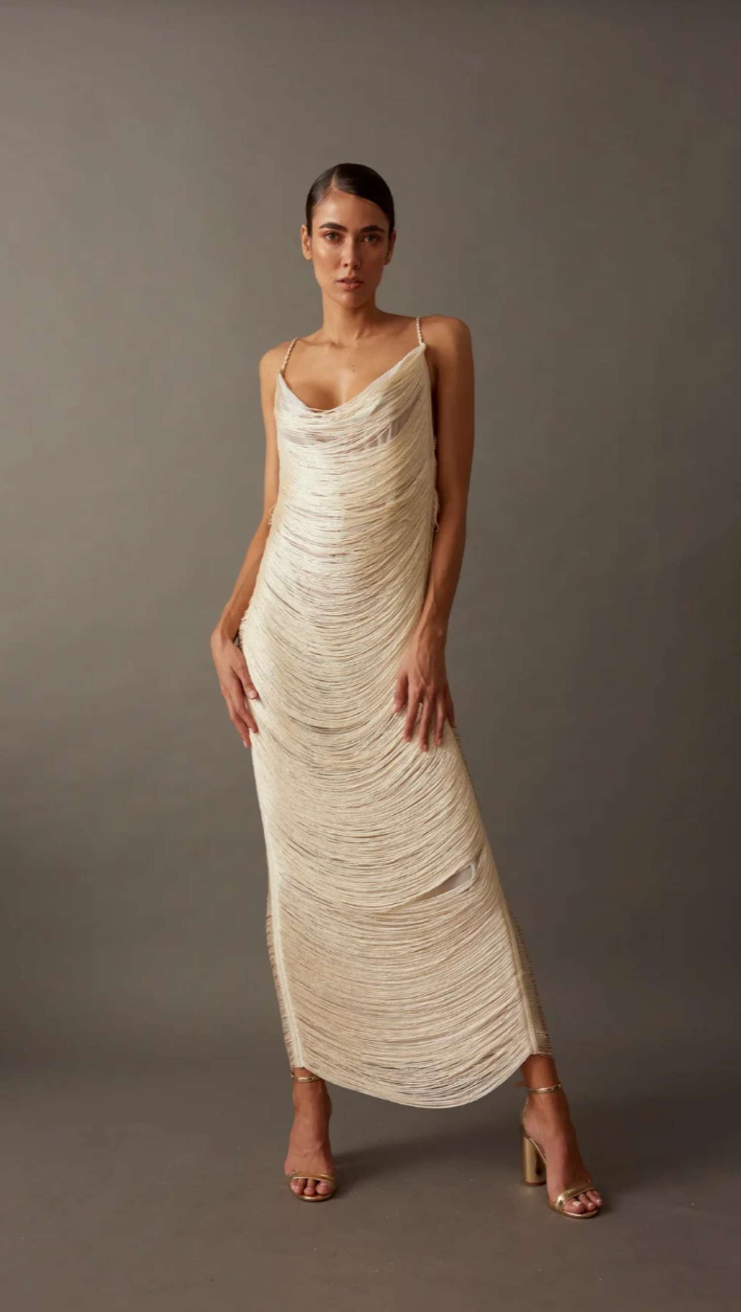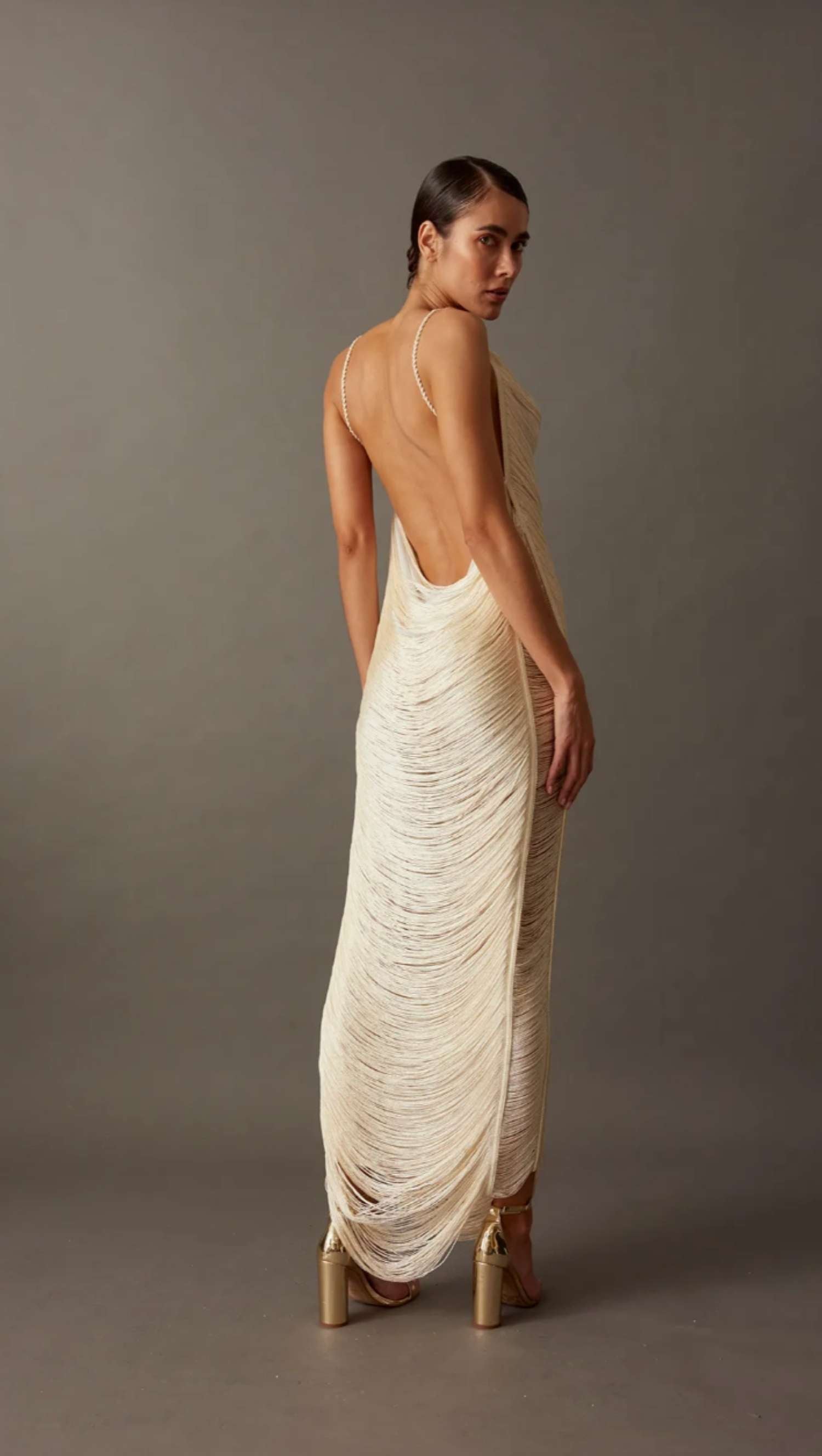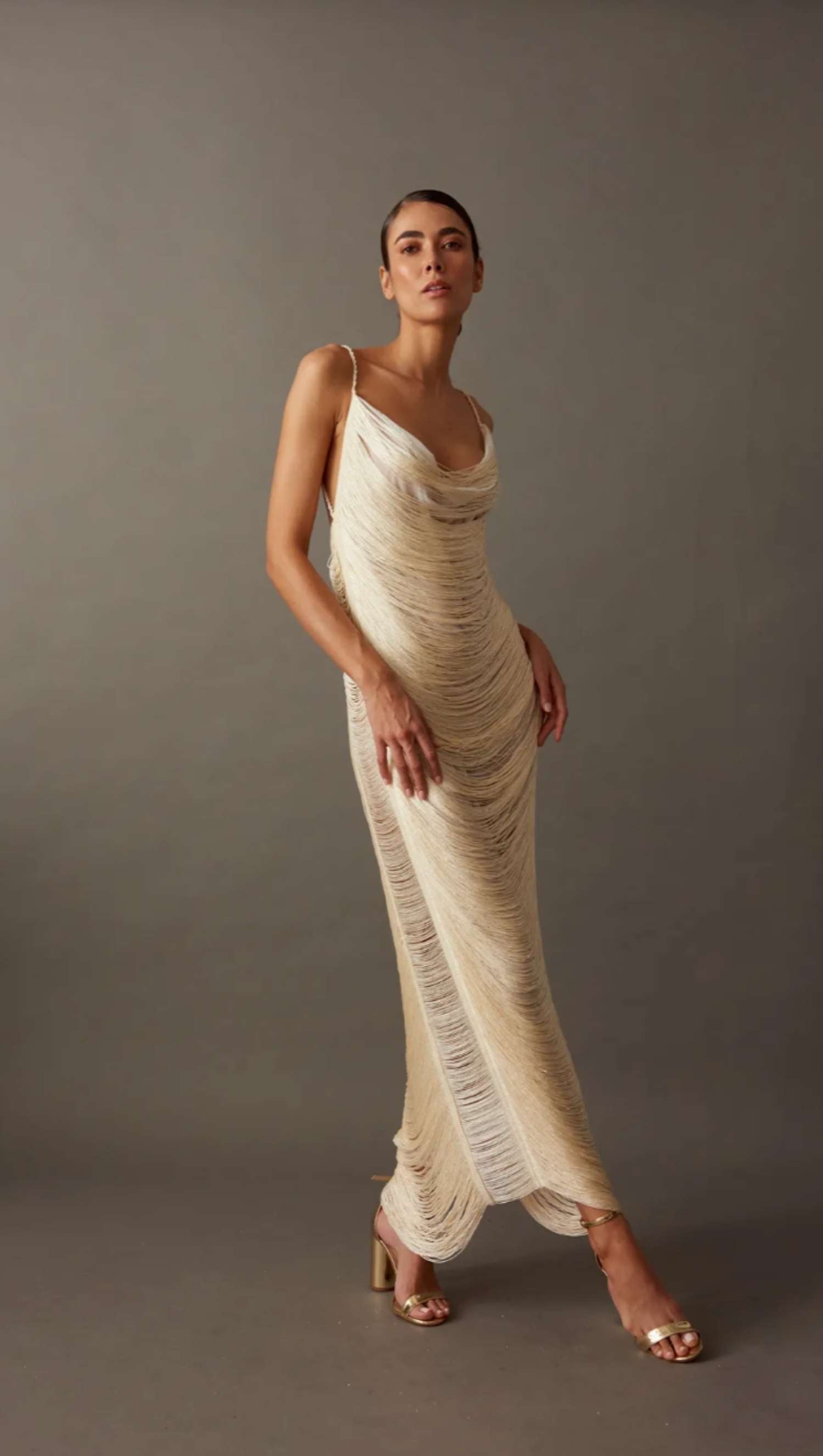 Introducing our gem, a one-of-a-kind creation measuring 130 centimeters in length. This stunning dress is defined by the graceful drape of its threads that envelop your silhouette.